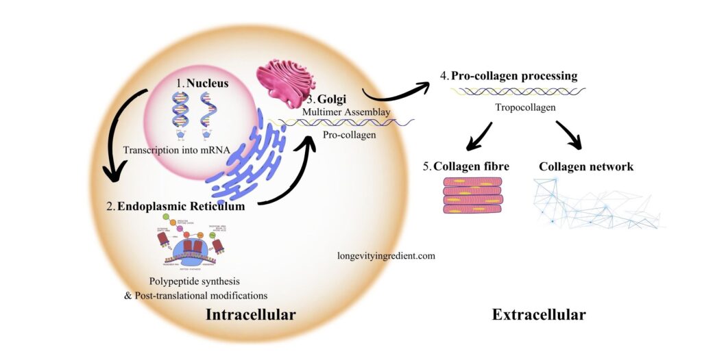 Intracellular Process: Inside the cell, genes are transcribed into mRNA, which is then translated by ribosomes to produce pre-pro-polypeptide chains. In the endoplasmic reticulum (ER), these chains undergo several modifications: the signal peptide is removed, proline and lysine residues are hydroxylated (a process that requires vitamin C), and glycosylation occurs. Three of these modified chains then twist together to form a triple helix structure called pro-collagen. The pro-collagen molecule moves to the Golgi apparatus and is subsequently secreted outside the cell.