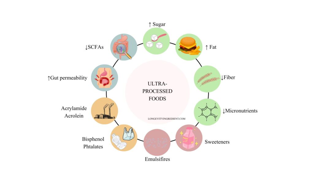 Ultra-processing destroys the food matrix and phytochemicals (natural chemicals produced by plants). Consuming these foods leads to increased gut permeability and inflammation while reducing the production of beneficial short-chain fatty acids (SCFAs) (Fig.2) (Tristan Asensi et al., 2023; Zhang et al., 2023).